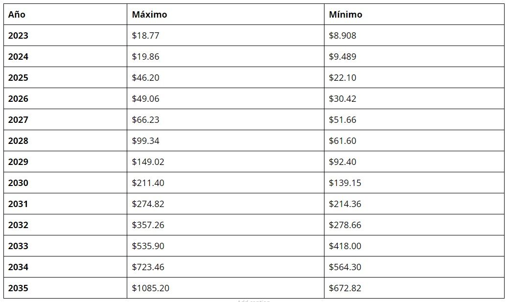 Entre 2023 y 2024, podemos esperar un periodo de consolidación que dé lugar a un movimiento en rango. El máximo anual en 2024 podría demorarse unos 217 días, con un cambio porcentual de 121.61 puntos que forme un máximo creciente rozando los 20 dólares.
