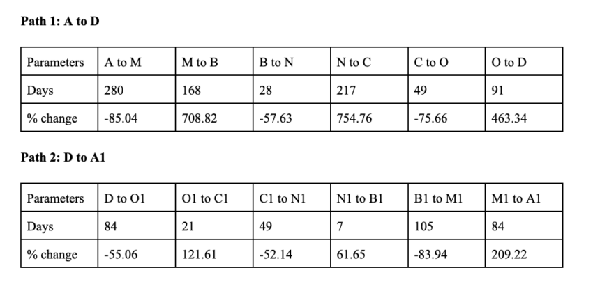 Con los máximos y mínimos marcados (que podrían actuar como líneas de soporte y resistencia), podemos definir las variaciones en el precio, incluyendo los cambios porcentuales y los periodos de tiempo.