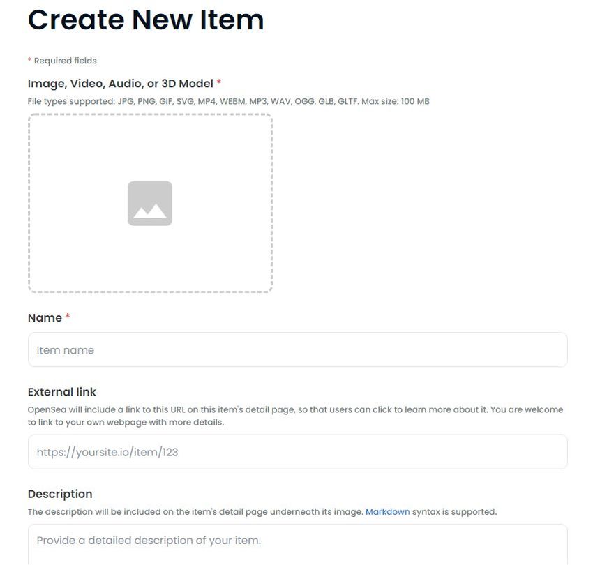 Para cada artículo o NFT, deberá proporcionar algunos detalles, que incluyen: