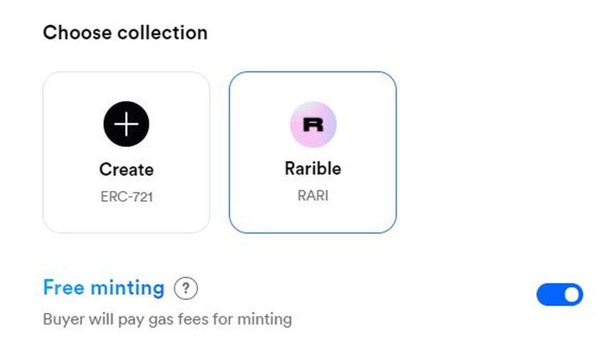 - Colección (elija Rarible para acuñar gratis)