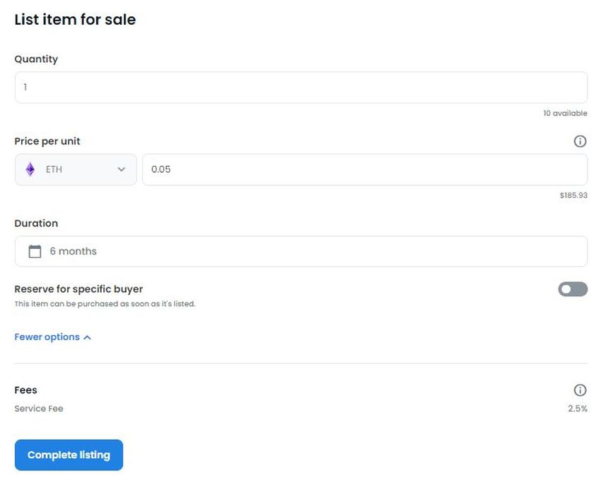 Una vez que haya configurado todos los detalles, haga clic en Completar lista y el NFT se incluirá en la lista para la venta.