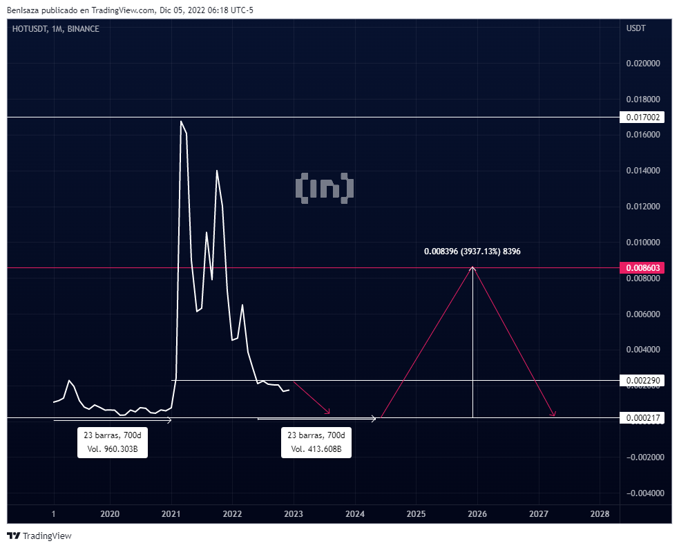 HOT podría volver a mínimos experimentados en el 2020, formando a su vez un rango de acumulación aproximado de 700 días. Apoyado por nuestra tesis técnica teórica de bulltrap, en este activo se podría apreciar una subida del 3,900% con objetivo el 50% de Fibonacci.