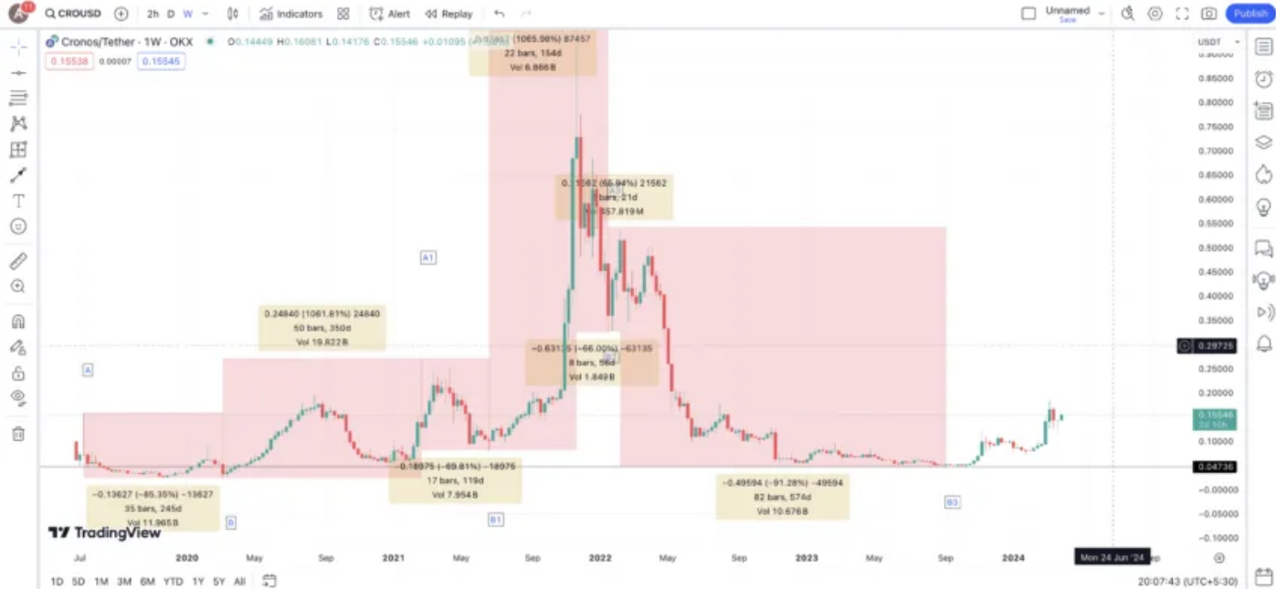 El gráfico semanal de CRO Coin muestra una tendencia interesante. Se observan forma múltiples patrones semanales como A-B-A1, A1-B1-A2, A2-B2-A3 y A3-B3, con C3 en espera de confirmación. Necesitamos identificar los movimientos de precios y el tiempo transcurrido entre cada punto de cada patrón.