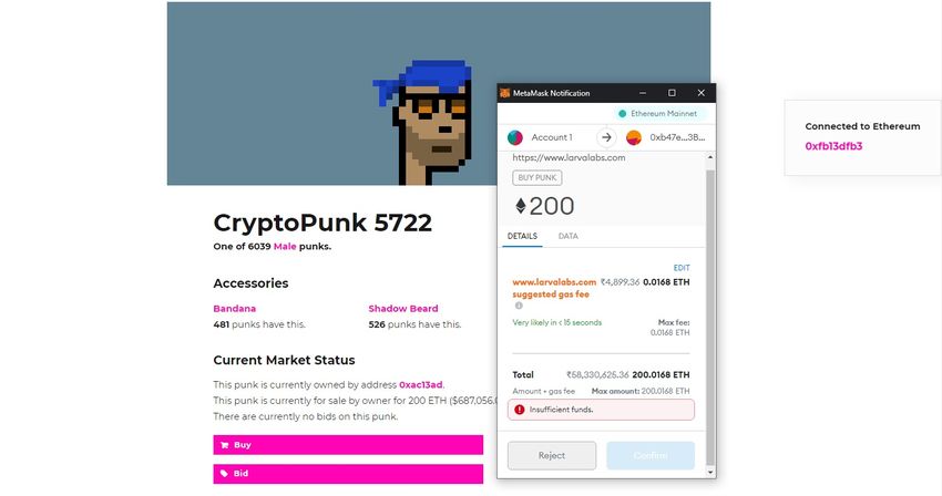 Comprar CryptoPunks en OpenSea no es muy diferente de lo anterior. Por ejemplo, necesita convertir su moneda fiduciaria a ETH. Necesita conectar su monedero de criptomonedas al sitio; en este caso, OpenSea. Y finalmente, realice el pago desde MetaMask.