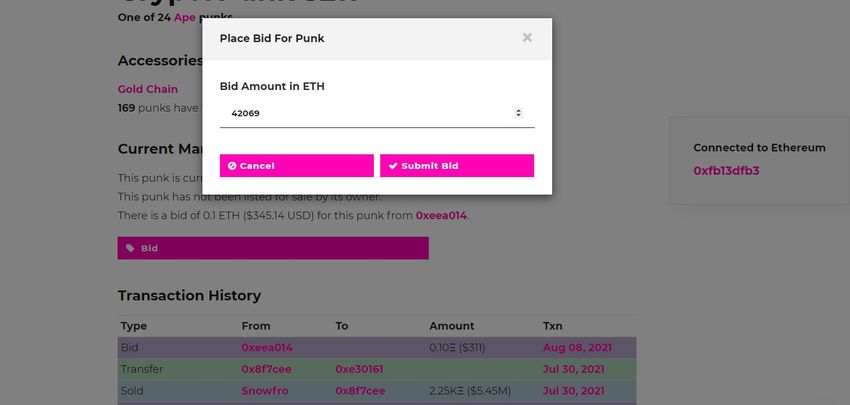 La opción Bounties (recompensas, en español) introducida por Ark Gallery lo resuelve en gran medida. Permite a los usuarios pujar por cualquier Wrapped CryptoPunk seleccionado al azar respaldado por un depósito ETH. Entonces, si no estás realmente preocupado por qué Punk estás obteniendo, esto es útil. Si el comprador acepta su oferta, es suya. Una de las mayores ventajas es que permite establecer un precio mínimo para los punks menos exclusivos.