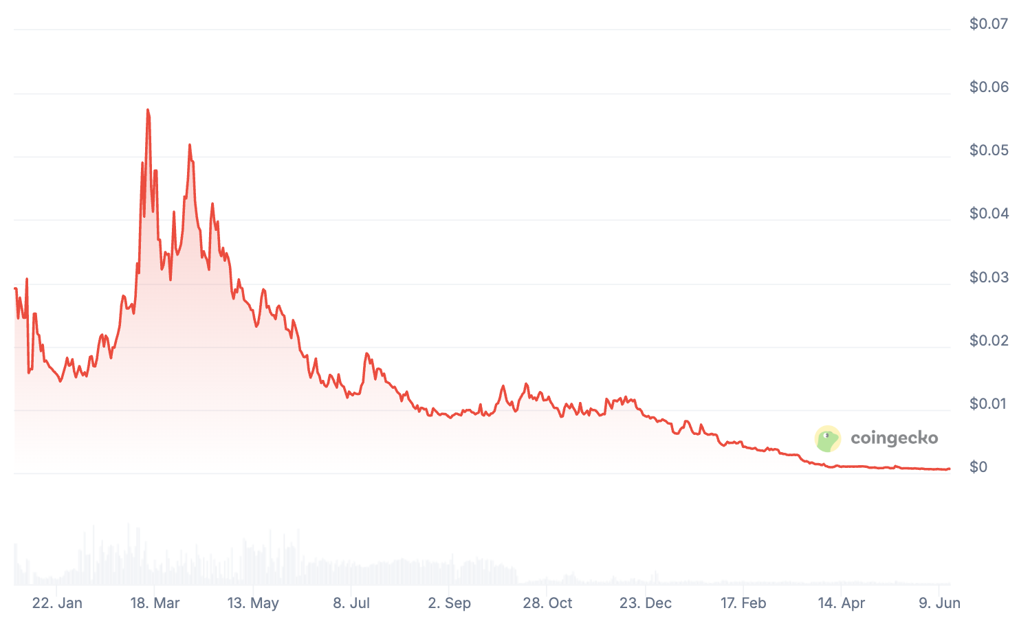 A partir de mediados de 2024, el token se estabilizó en niveles mucho más bajos, y en 2025 se acercó a precios cercanos a su mínimo histórico. Esto refleja una clara falta de adopción y confianza en el proyecto, ya que no ha conseguido mantener el interés de los inversores ni de los usuarios. El precio actual muestra que el mercado ha perdido la confianza en el token, lo cual se ve reflejado en su bajo volumen de transacciones y la falta de actividad en la plataforma.