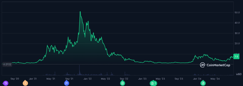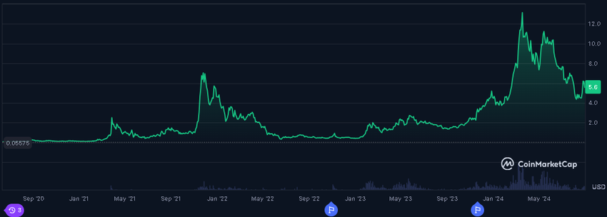 Su evolución en estos últimos años ha sido positiva. Desde los apenas tres centavos de dólar que valía a mediados de 2020, llegó a cotizar por encima de los 13 dólares en marzo de 2024. Tras este ATH, el token ha retrocedido hasta los 5 dólares en agosto, con más de un 15400% de revalorización desde el mínimo histórico.