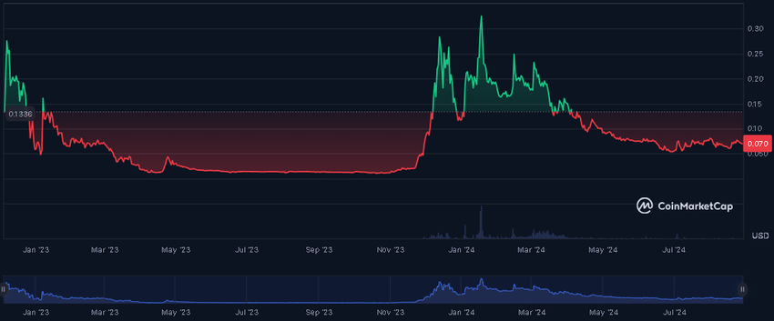 El proyecto lleva en activo más de un año. Desde comienzos de 2023, su token nativo ha experimentado dos caídas significativas. La primera, tras el lanzamiento; la segunda, durante la corrección del rally de finales de 2023, llegando a perder hasta un 82% desde su ATH, en torno a los 0.35 dólares.
