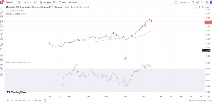 EFUT de VanEck cotiza a 30 dólares a 15 de marzo de 2024, según este gráfico.