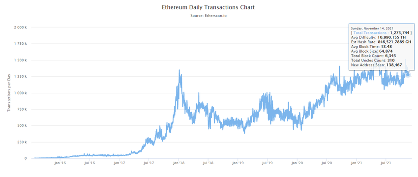Etherscan es una herramienta ingeniosa que rastrea todas esas transacciones. Sobre la base de estos datos sin procesar, Etherscan puede compilar una serie de estadísticas que nos dicen qué está sucediendo en el ecosistema de Ethereum. Por ejemplo, mientras que las transacciones diarias de Etherscan trazan el total de transacciones en un momento dado, el gráfico también nos brinda estadísticas clave sobre el tráfico de Ethereum:
