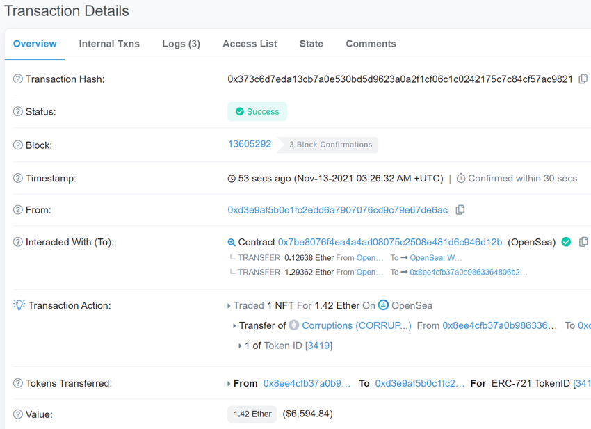 En esta transacción aleatoria, podemos ver que alguien intercambió un NFT del marketplace NFT más grande, OpenSea, por aproximadamente 6,600 dólares.