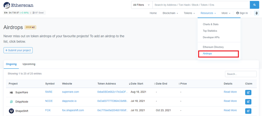 En la categoría “Recursos” de Etherscan, encontrará la lista de airdrops en curso y futuros. Esta es una excelente manera de ganar tokens gratis, que podrían apreciarse más adelante. En “Leer más” para cada listado, el remitente del airdrop tendrá una descripción detallada de todos los requisitos previos para que los tokens se depositen en su monedero.