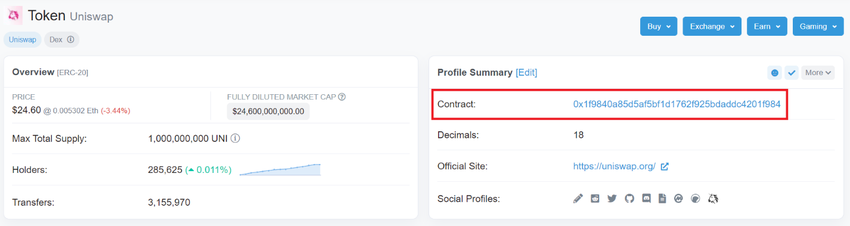 Debajo del “Resumen del perfil” se encuentra la dirección del contrato inteligente de Uniswap.