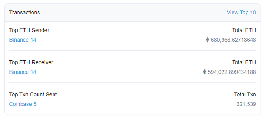 Esta es una buena forma de detectar ballenas de criptomonedas, ya que cada transacción no solo contiene el nombre del protocolo utilizado, sino también su valor. Como era de esperar, las principales ballenas de cripto son los exchanges de criptomonedas.