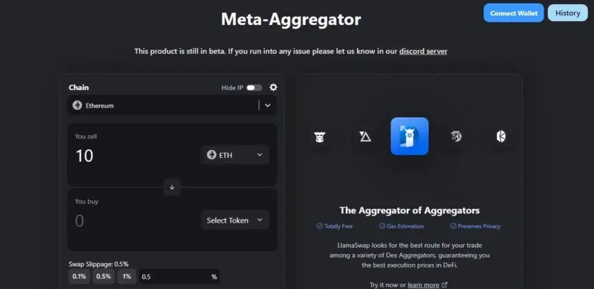 DefiLlama ha lanzado recientemente la función meta-DEX, que se encuentra en fase de pruebas. Ayuda a los usuarios a encontrar el mejor precio para realizar operaciones y permutas en plataformas y agregadores, tales como 1inch y Cowswap.