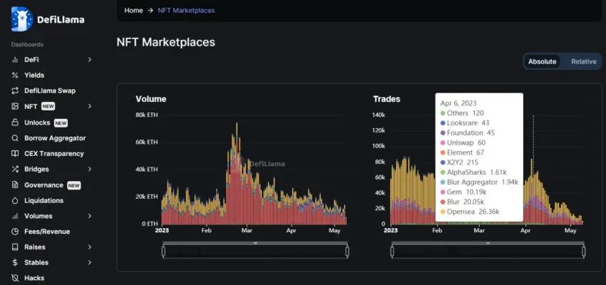 El agregador de NFT de DefiLlama permite la exploración de las principales colecciones de NFT, así como comparar marketplaces por volumen y operaciones. Esta función muestra datos relevantes sobre los NFT: precio mínimo, oferta total, fluctuaciones, etc.