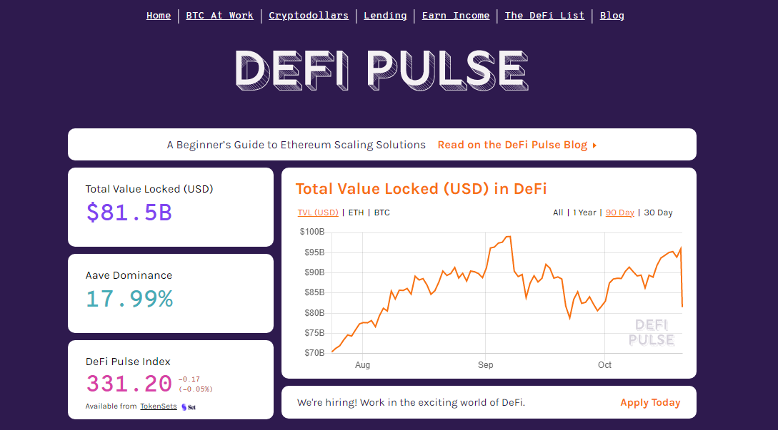 DeFi Pulse es una tabla de clasificación de todas las aplicaciones DeFi. Este recurso líder puede ayudarle a realizar un seguimiento de todos sus activos y proyectos DeFi. Los entusiastas de las criptomonedas también pueden utilizar DeFi Pulse para obtener las últimas clasificaciones y análisis sobre la mayoría de los protocolos DeFi.