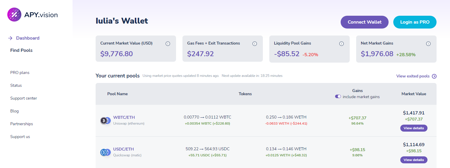 A diferencia de otras herramientas, APY.Vision proporciona un análisis profundo de las posiciones de entrada y salida de su inversión. También puede generar datos para analizar la pérdida impermanente frente a los ingresos por holding.