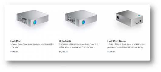 Como dispositivos dedicados de alojamiento Holo fáciles de usar, los HoloPorts sirven como un puente entre la comunidad que ejecuta las aplicaciones distribuidas de Holochain y los visitantes de la web. Los propietarios de HoloPorts pueden cobrar tarifas por su servicio de alojamiento y ganar HoloFuel. HoloPorts vienen en dos tamaños: el HoloPort y el HoloPort +.