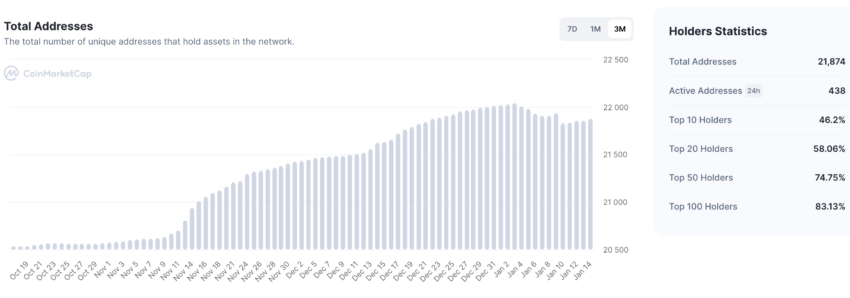 En cuanto a las direcciones, han caído en los últimos tres meses, aunque se ha observado un ligero repunte con la recuperación del mercado en enero. El único dato negativo es que el 83% de la oferta circulante está en poder de los 100 principales holders. Si el actual rally se traduce en una toma de beneficios por parte de estos holders, el precio podría desplomarse.