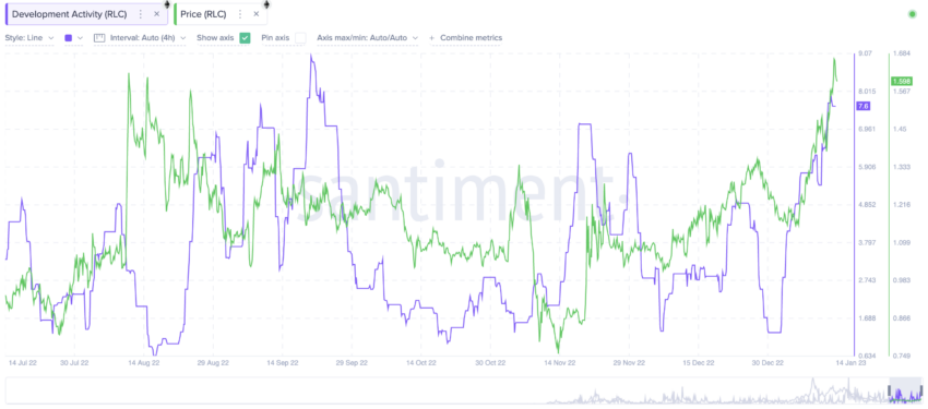 El precio también depende de la actividad de los desarrolladores, que ha experimentado un crecimiento paralelo al repunte del precio en enero. No menos importante es la volatilidad, que sigue manteniéndose por debajo de los niveles observados en noviembre de 2022. En el caso de la volatilidad, parece existir una relación directa con el precio. La cotización del token RLC aumenta cada vez que sube el nivel de volatilidad.