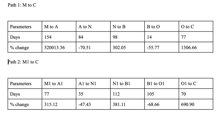 Los datos de las tablas anteriores nos servirán para calcular las medias necesarias para proyectar el precio. El siguiente máximo (A2) podría formarse en un periodo de 98 días, siendo el aumento cercano al 600%.
