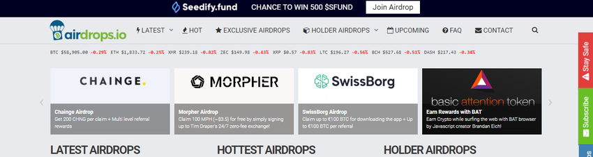 Airdrops.io, uno de los mayores agregadores de airdrops de criptomonedas, está casi configurado como una bolsa de valores con todos los airdrops entrantes y salientes y los precios de los tokens.