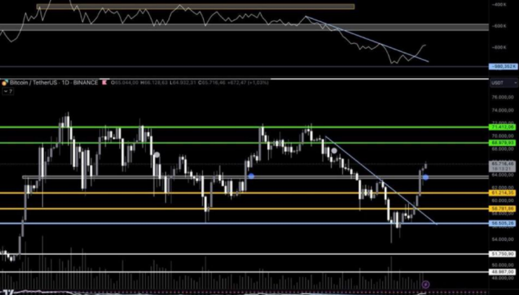 El OBV puede utilizarse en cualquier marco temporal, pero es especialmente eficaz en gráficos diarios. En el siguiente gráfico de Bitcoin, se observa una ruptura de la línea de tendencia bajista del indicador: una posible señal anticipada de un cambio alcista en el precio.