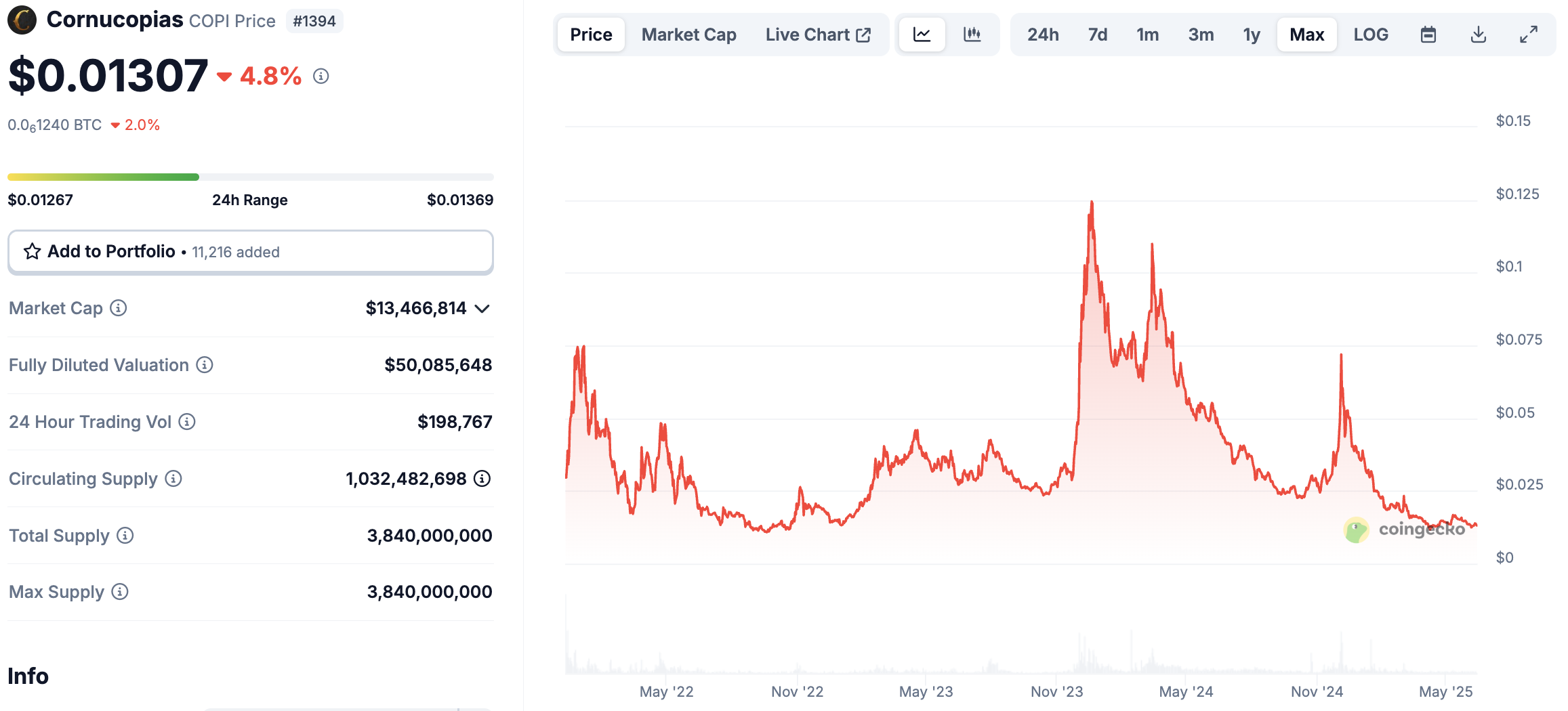 Desde 2022, la tendencia general de COPI ha experimentado una volatilidad significativa, con varios picos y caídas notables. Desde un precio inicial relativamente bajo, COPI alcanzó varios picos de valor en los meses de mayo y noviembre de 2022, lo que sugiere que hubo eventos o desarrollos positivos que impulsaron su precio en esos momentos.