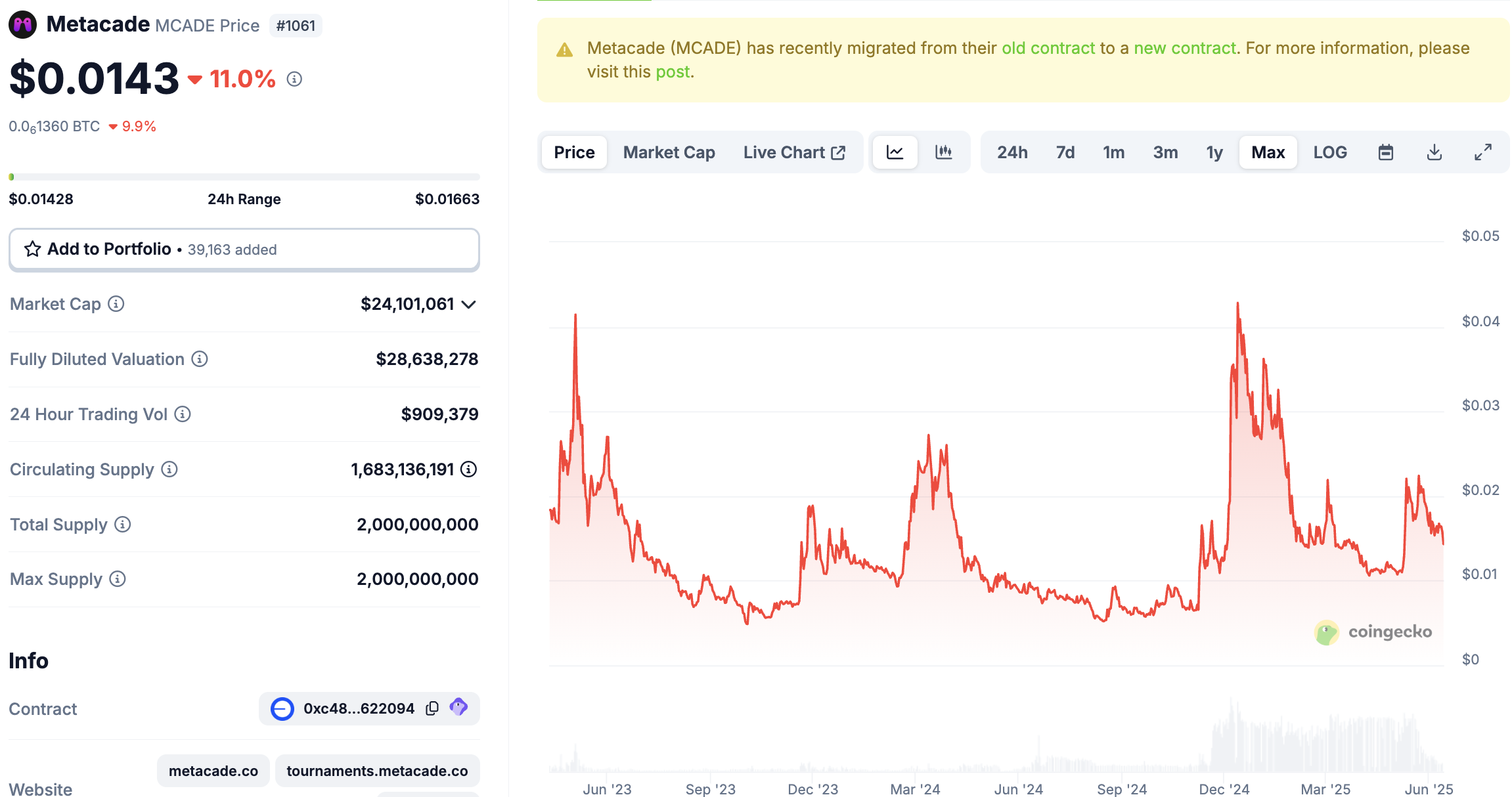 El precio de MCADE ha fluctuado significativamente desde su lanzamiento en 2023. La gráfica destaca varios aumentos notables en el precio, especialmente entre diciembre de 2023 y marzo de 2024, seguidos de correcciones. Estos aumentos y las posteriores caídas podrían deberse a cambios en el sentimiento del mercado, anuncios importantes o eventos técnicos relacionados con MCADE, como nuevas listas en intercambios o asociaciones.