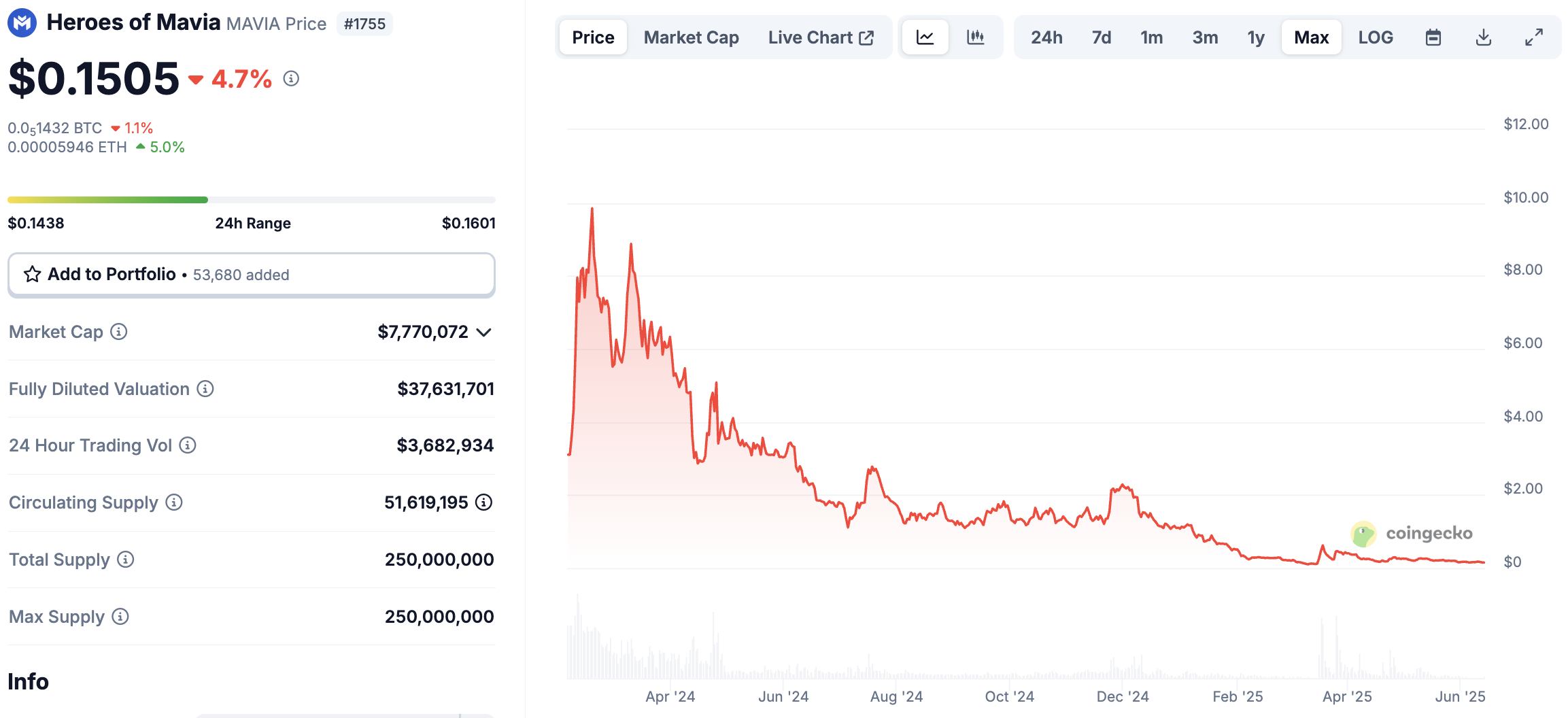 MAVIA es el token nativo del juego. Su precio experimentó un aumento rápido al principio de 2024, alcanzando un pico pronunciado, en lo que podría ser una fase de euforia inicial. Después de este pico, el precio corrigió con fuerza. Hacia finales de 2024, el precio parece estabilizarse con fluctuaciones pequeñas, lo que sugiere que el mercado ha encontrado un nivel base o que el token no ha logrado ganar tracción después de la subida especulativa.