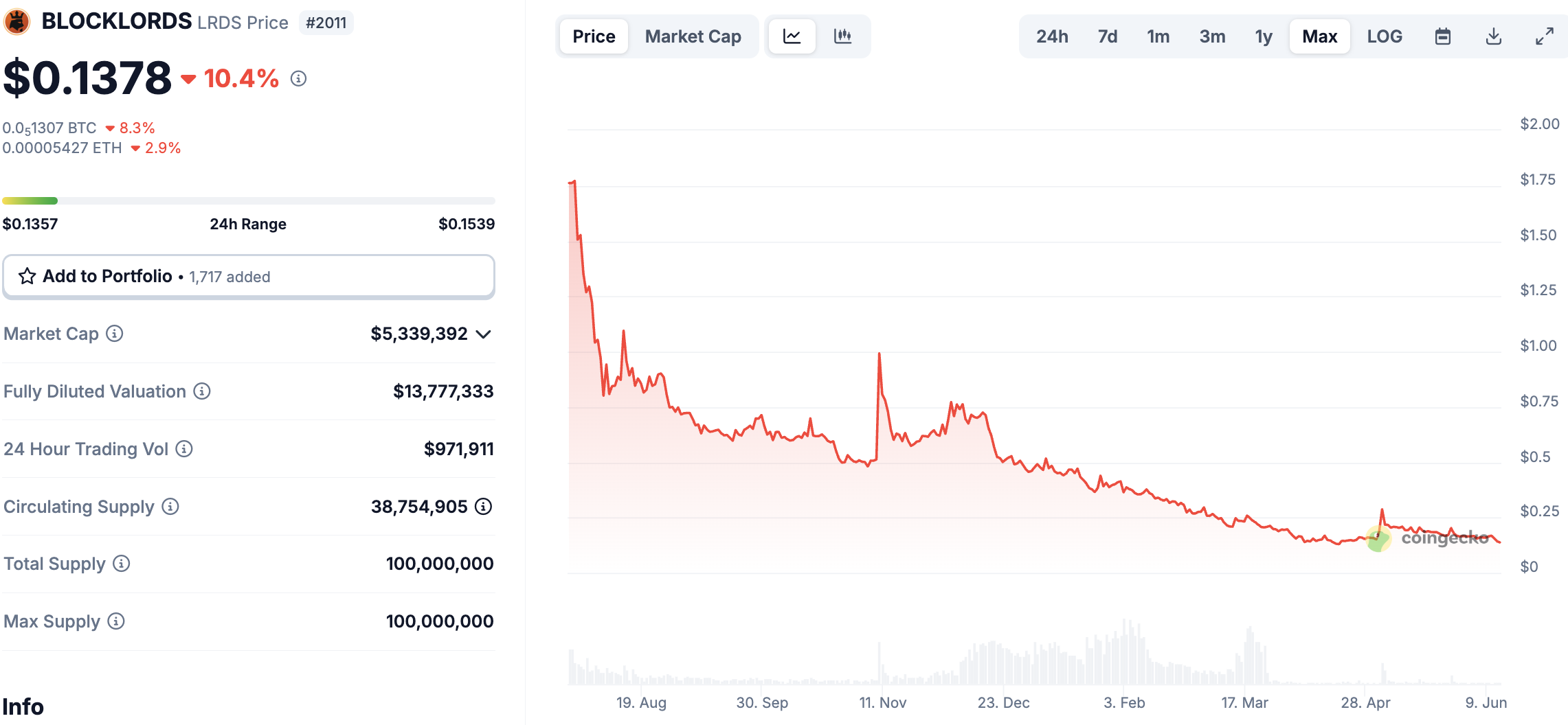A lo largo del tiempo, la gráfica muestra una tendencia de caída constante, con el precio estableciéndose por debajo de los $0.50 y cayendo hasta los $0.13. Parece que el token no ha logrado mantener el interés de los inversores, lo que podría estar relacionado con una falta de desarrollos significativos o actualizaciones en el proyecto.