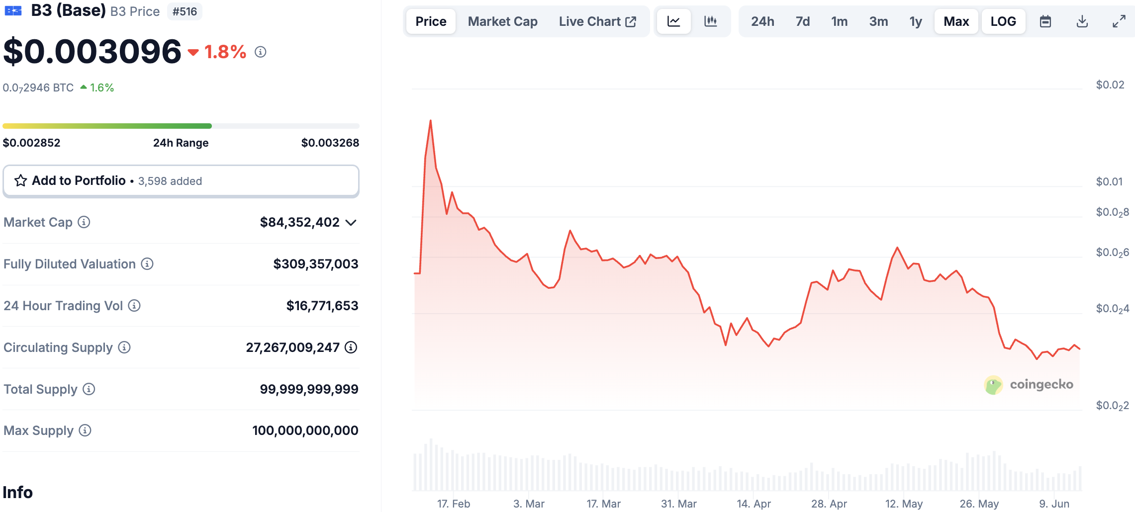 El precio de B3 ha pasado por fluctuaciones significativas, con picos que luego se corrigen con caídas abruptas. Estas oscilaciones pueden reflejar tanto la especulación de los inversores como las reacciones a eventos específicos del mercado o del entorno macroeconómico que afectan a la criptomoneda.
