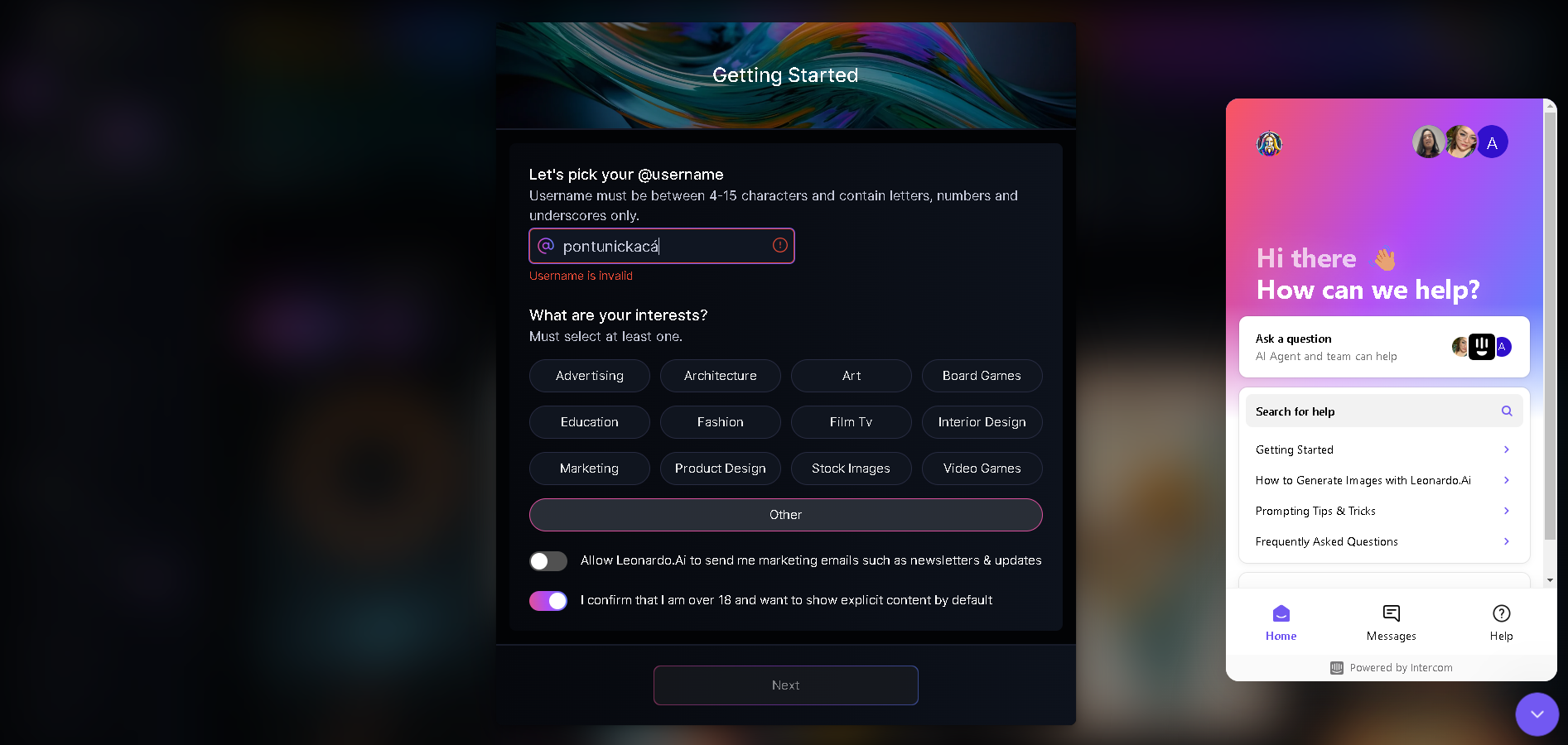 Paso 3. Crea tu perfil generando un nombre de usuario, indicando algún interés y confirmando que tienes más de 18 años. Si tienes cualquier duda, puedes clicar en el icono de ayuda en la esquina inferior izquierda.
