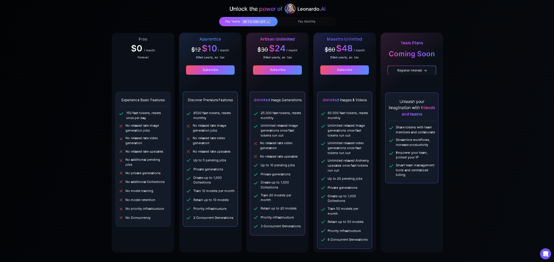 Ahora que sabemos cómo usar Leonardo AI, hablemos de precios. Tenemos cuatro planes disponibles, uno de ellos gratuito. Las opciones de pago oscilan entre los 10 y los 48 dólares mensuales. En el plan gratuito, el máximo es de 150 imágenes por día, superando las 4000 generaciones mensuales.