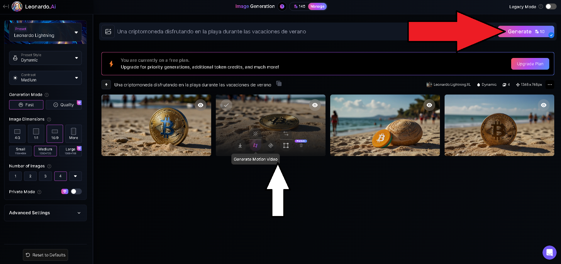 Paso 1. Escribe un prompt en la barra superior. Para este ejemplo, le pediremos a Leonardo AI “Una criptomoneda disfrutando en la playa durante las vacaciones de verano“.