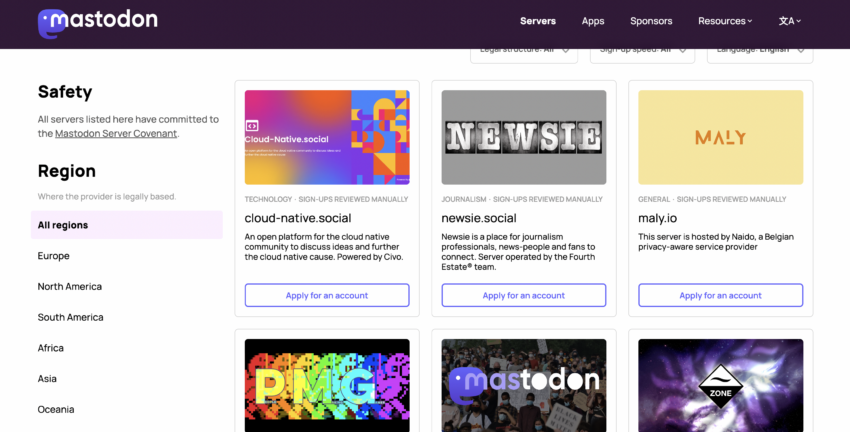 Ya hemos hablado de la posibilidad de crear en Mastodon comunidades con sus propias normas. Gracias a los servidores (llamados “instances”), los usuarios pueden delimitar la actividad en función de temas concretos o reglas específicas. Esto obliga a los usuarios a elegir la red de la que quieren formar parte, aunque siempre pueden interactuar con usuarios de otras redes.