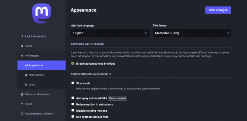 - Si quieres seguir usando Mastodon en el navegador web, haz clic en “Preferences” y activa la opción “Enable advanced web interface”.