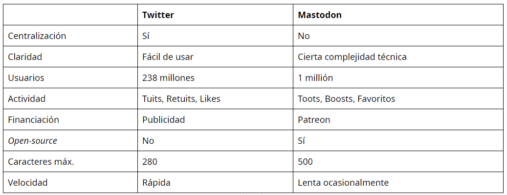 Mastodon es una red open–source basada en el protocolo ActivityPub, gracias al cual pueden conectarse todas las aplicaciones del fediverso al que pertenecen. El código de Mastodon es de acceso libre, puede descargarse y permite la realización de cambios; el de Twitter, no.