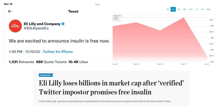 - La tarifa ”blue tick” también fue motivo de crítica debido a la posibilidad de que impostores pudieran hacerse pasar por cuentas oficiales simplemente pagando. El caso de la farmacéutica Eli Lily fue sonado: un tuit anunciando insulina gratuita tumbó el valor de sus acciones en torno a 4.5 puntos.
