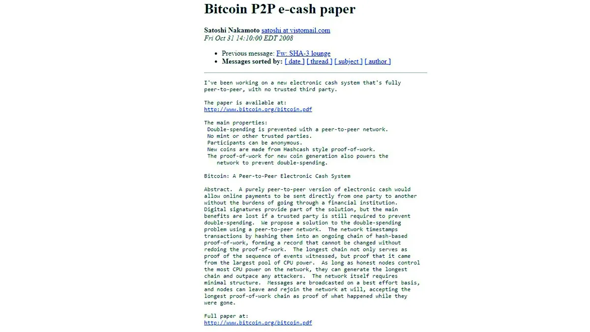 En este famoso Whitepaper, Nakamoto combinó varias invenciones previas tales como b-money y HashCash, para crear un sistema de efectivo electrónico completamente descentralizado, que no dependiera de una autoridad central para su emisión o la liquidación y validación de transacciones.