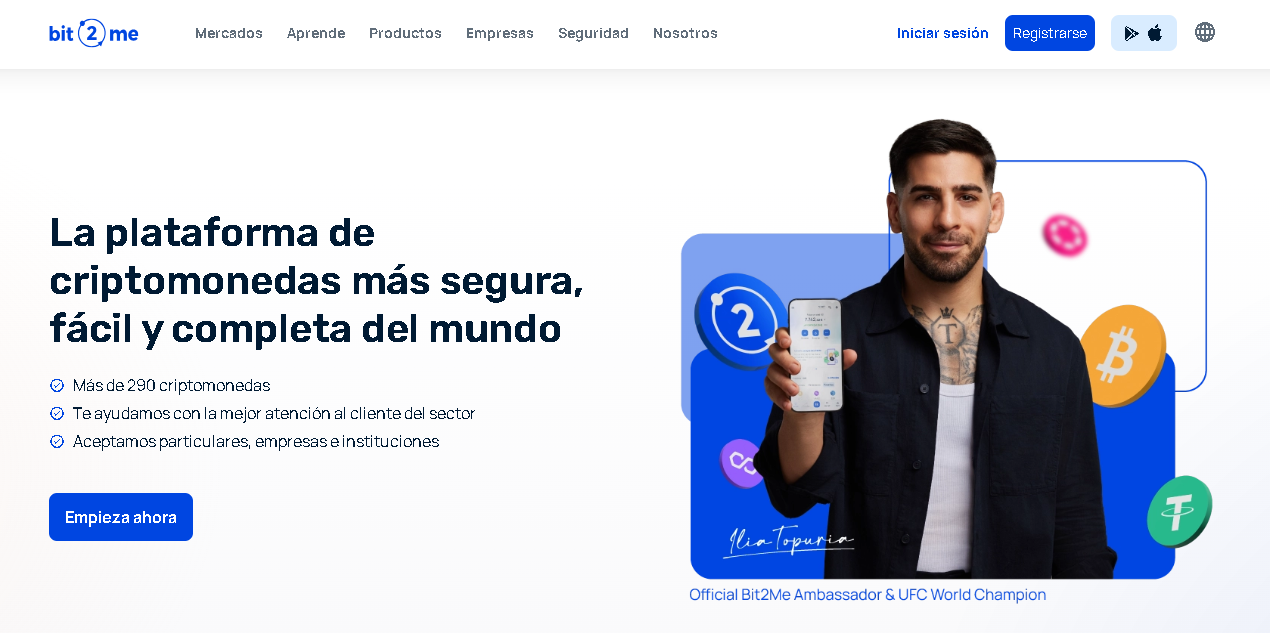 Bit2Me es un exchange centralizado (CEX) con sede en España, Desde su fundación en 2014, ha ganado popularidad por ofrecer una plataforma intuitiva para la compraventa de criptomonedas. Uno de sus puntos fuertes es la seguridad: está considerado como uno de los CEX más seguros del mercado por sus elevada regulación y sus mecanismos para proteger la información y los fondos de los usuarios.