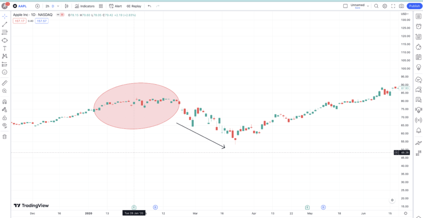 A continuación, vemos una gráfica diaria que muestra la cotización de Apple (AAPL) en 2020. Se enmarca una fase de distribución seguida de una caída significativa en el precio de las acciones del gigante tecnológico.