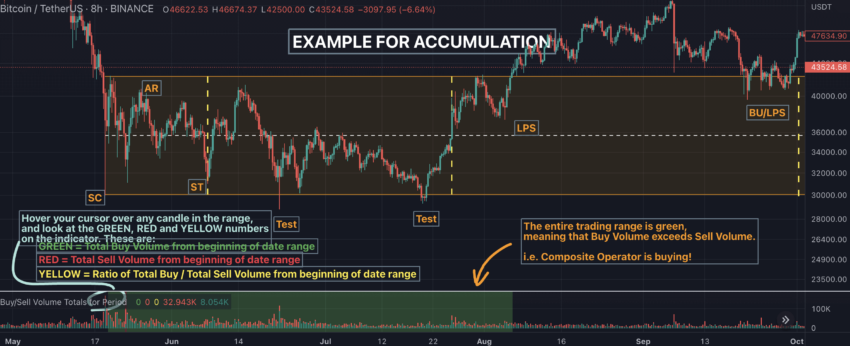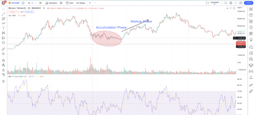 Esta fase comienza tras una caída del precio. Se caracteriza por la realización de compras constantes a precios bajos. Las fluctuaciones son ligeras y el volumen de compras creciente. La gráfica siguiente muestra una estructura de Wyckoff, cuya fase de acumulación queda confirmada con el RSI y el volumen.