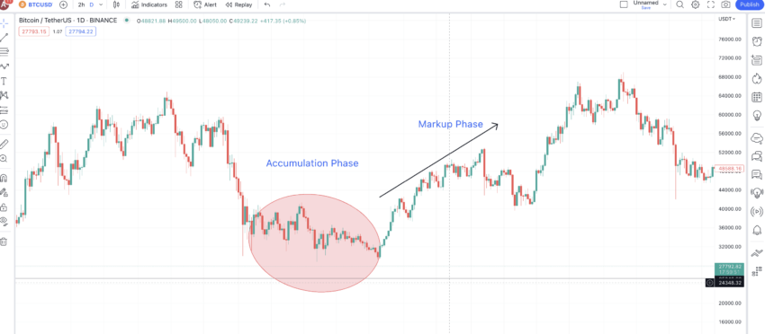 La primera fase tiene que ver sobre todo con los grandes capitales. En este punto, las manos fuertes acumulan un activo en particular. En el caso del mercado cripto, podría tratarse de un periodo en el que traders profesionales compran BTC siguiendo una estrategia de acumulación.
