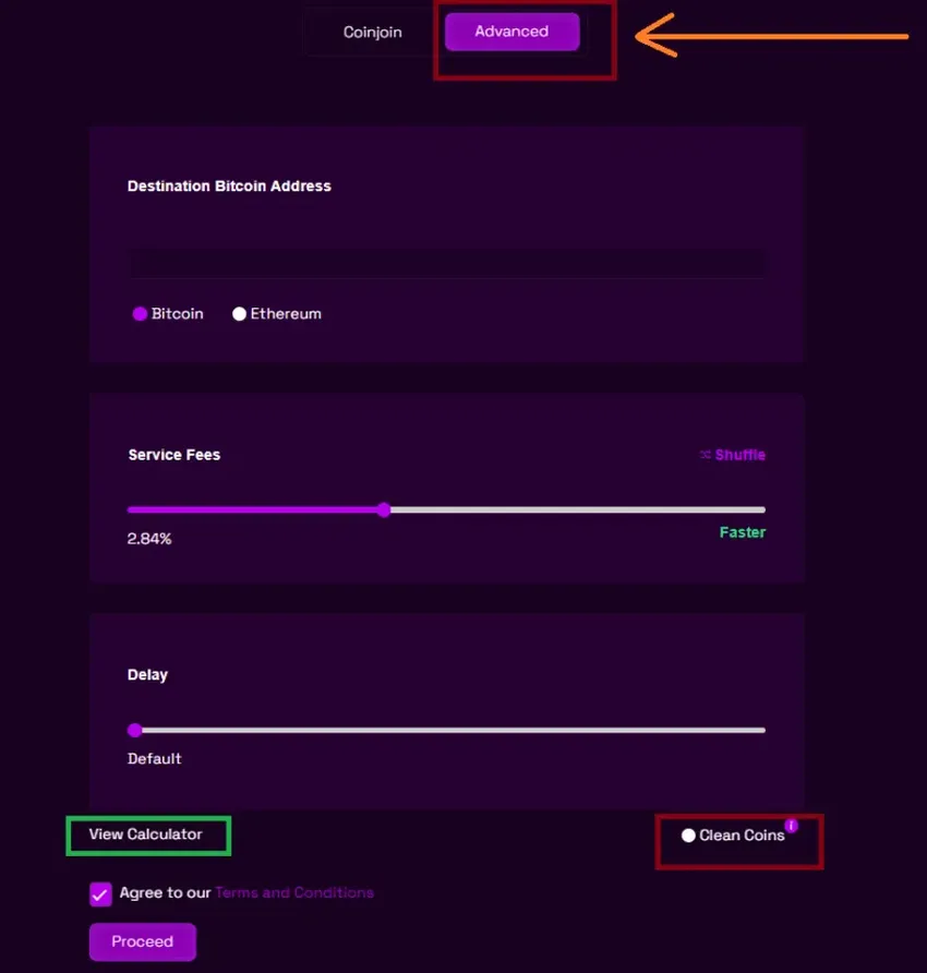 PASO 2 – MONERO. Clica en “Advanced” para usar Monero en lugar de CoinJoin. Esta opción te permite mezclar BTC y ETH. Indica la dirección de destino, la tarifa de servicio y el tiempo de retraso. Clicando en “Clean Coins”, recibirás tokens procedentes plataformas que cumplen con las regulaciones AML.