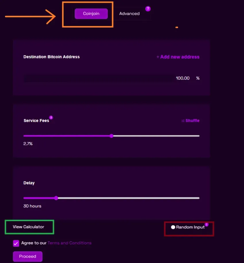 PASO 2 – COINJOIN. Selecciona CoinJoin si quieres usarlo. Indica la dirección de destino y elige una tarifa de servicio (mayor tarifa: mayor rapidez). También puedes aplicar retrasos. Comprueba cuánto BTC se enviará usando la opción “View Calculator”. Seleccionando “Random Input”, se envían los fondos a una cantidad aleatoria de direcciones de entrada.
