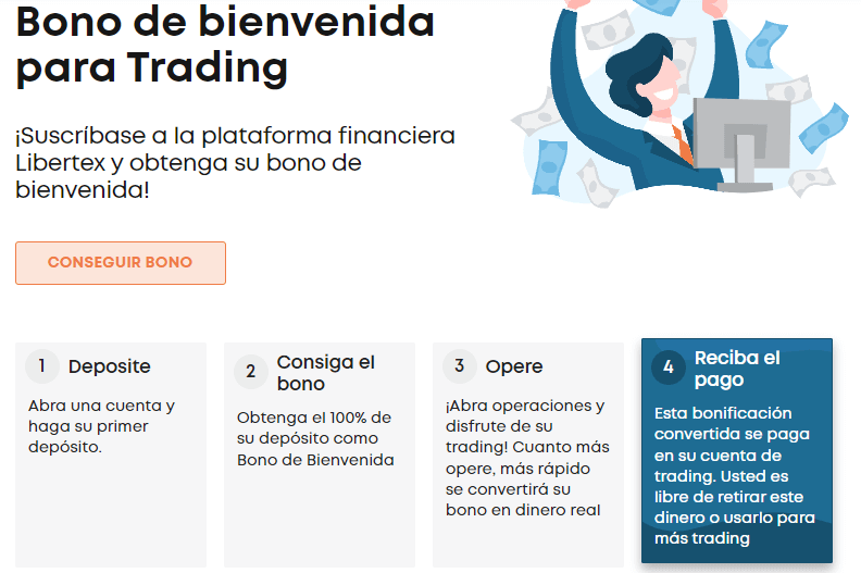 Al realizar el primer depósito en su cartera de Libertex, obtendrá un beneficio del 100%, eso quiere decir que si deposita 50 USD recibirá una bonificación de 50 USD para poder realizar futuros trading. Ciertas condiciones y límites aplican.