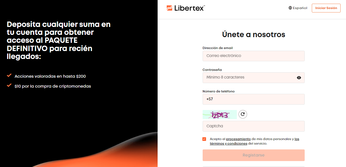 - Paso 1: el proceso de registro es muy sencillo, solo debe ingresar a su portal oficial www.libertex.org o descargar su aplicación. Luego, debes registrarte con un correo y número móvil para acceder a la plataforma.