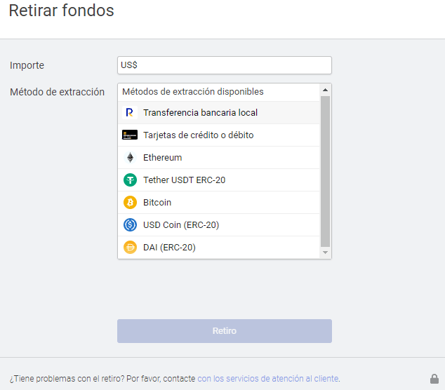 Nuevamente, uno de los métodos más sencillos y con bajas comisiones es el retiro con Bitcoin. Sin embargo, se puede emplear la red de Ethereum o que el depósito sea generado a una cuenta bancaria, asumiendo costos de bancos internacionales o nacionales.